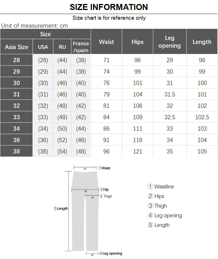 Waist sizes range from 28 to 38 inches (Chinese sizing)