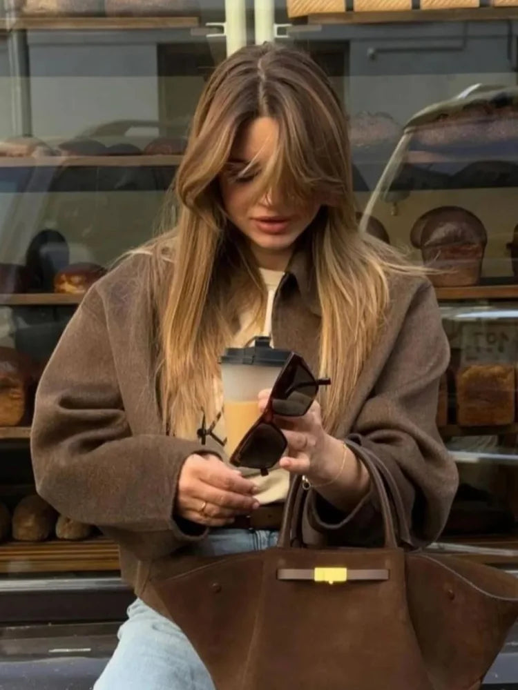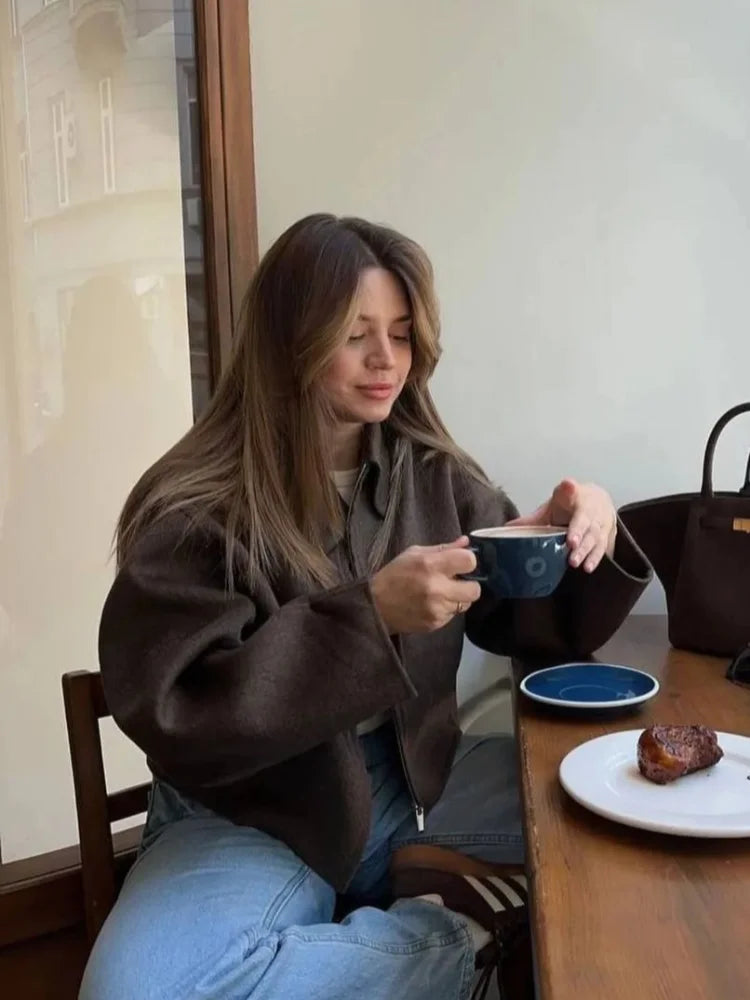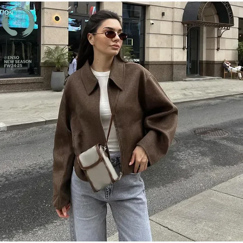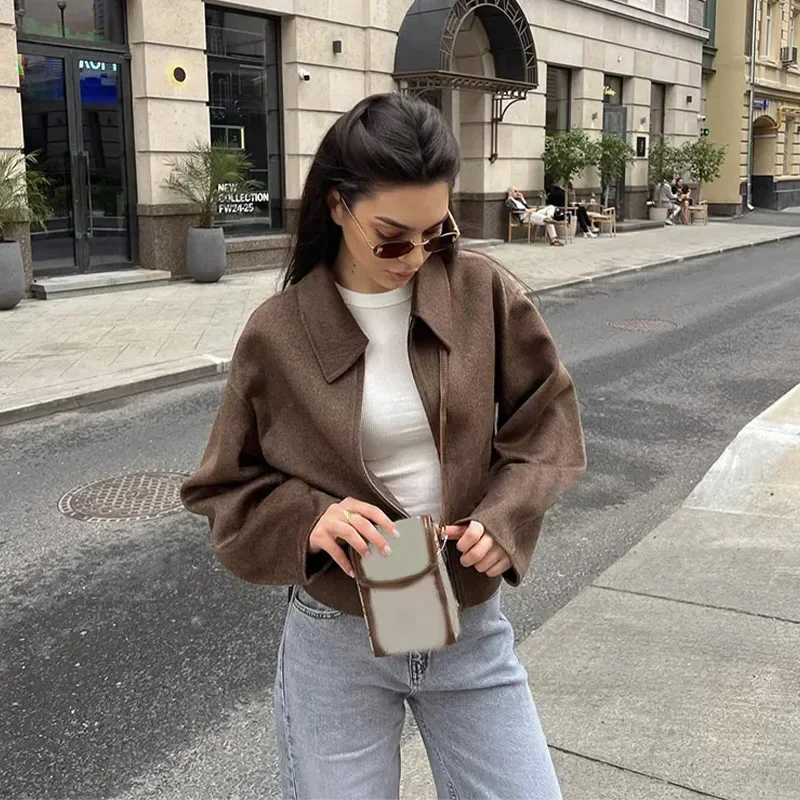 Women's Vintage Short Wool Blend Coat – Casual Zipper Jacket with Lapel Collar, Long Sleeves, Cozy Autumn 2024 Streetwear