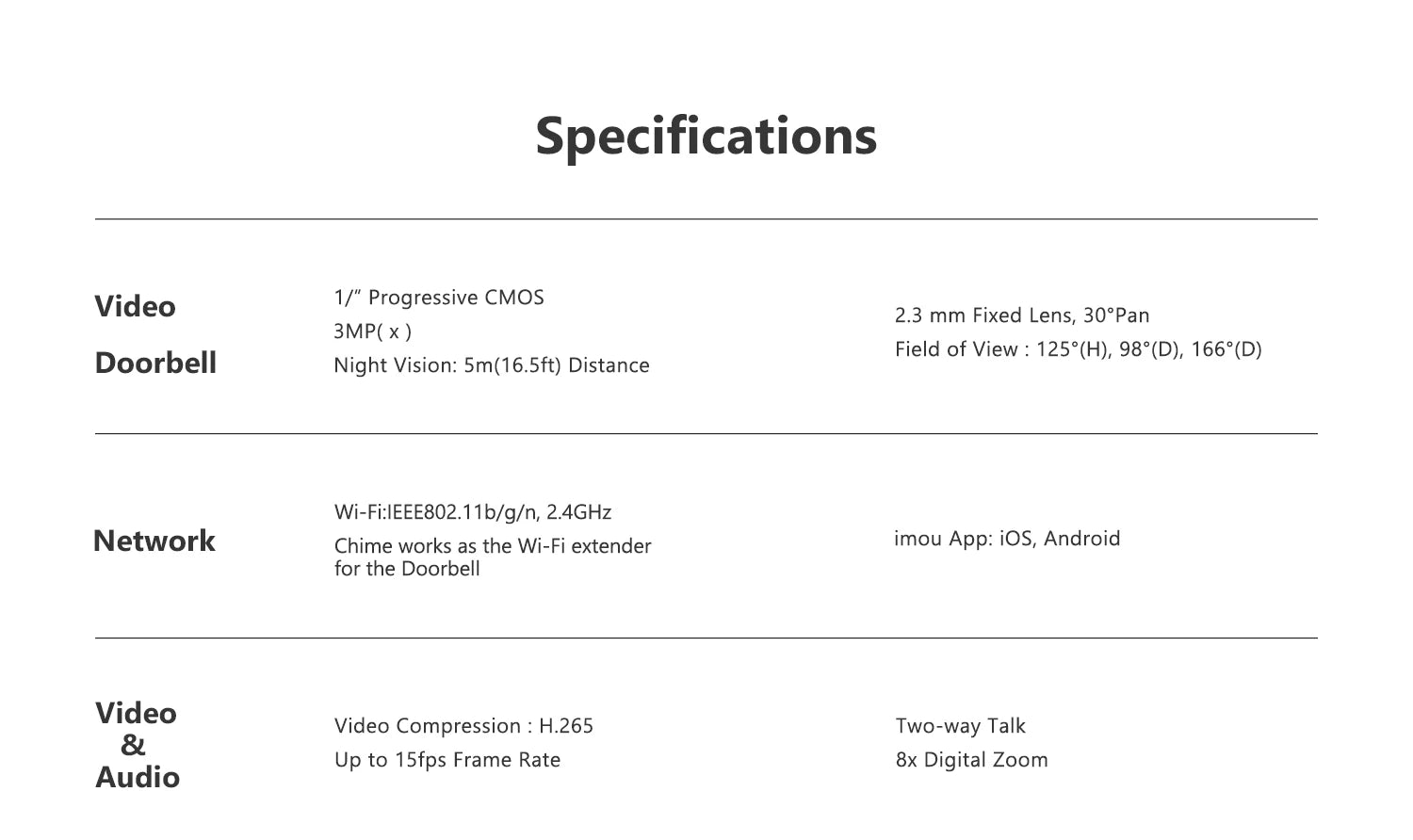 Stay connected and secure with the IMOU Video Doorbell 2S. Featuring a 3MP progressive CMOS sensor and a wide 125° field of view, this doorbell captures clear video with up to 8x digital zoom. The 2.3mm fixed lens offers a 30° pan for enhanced coverage.