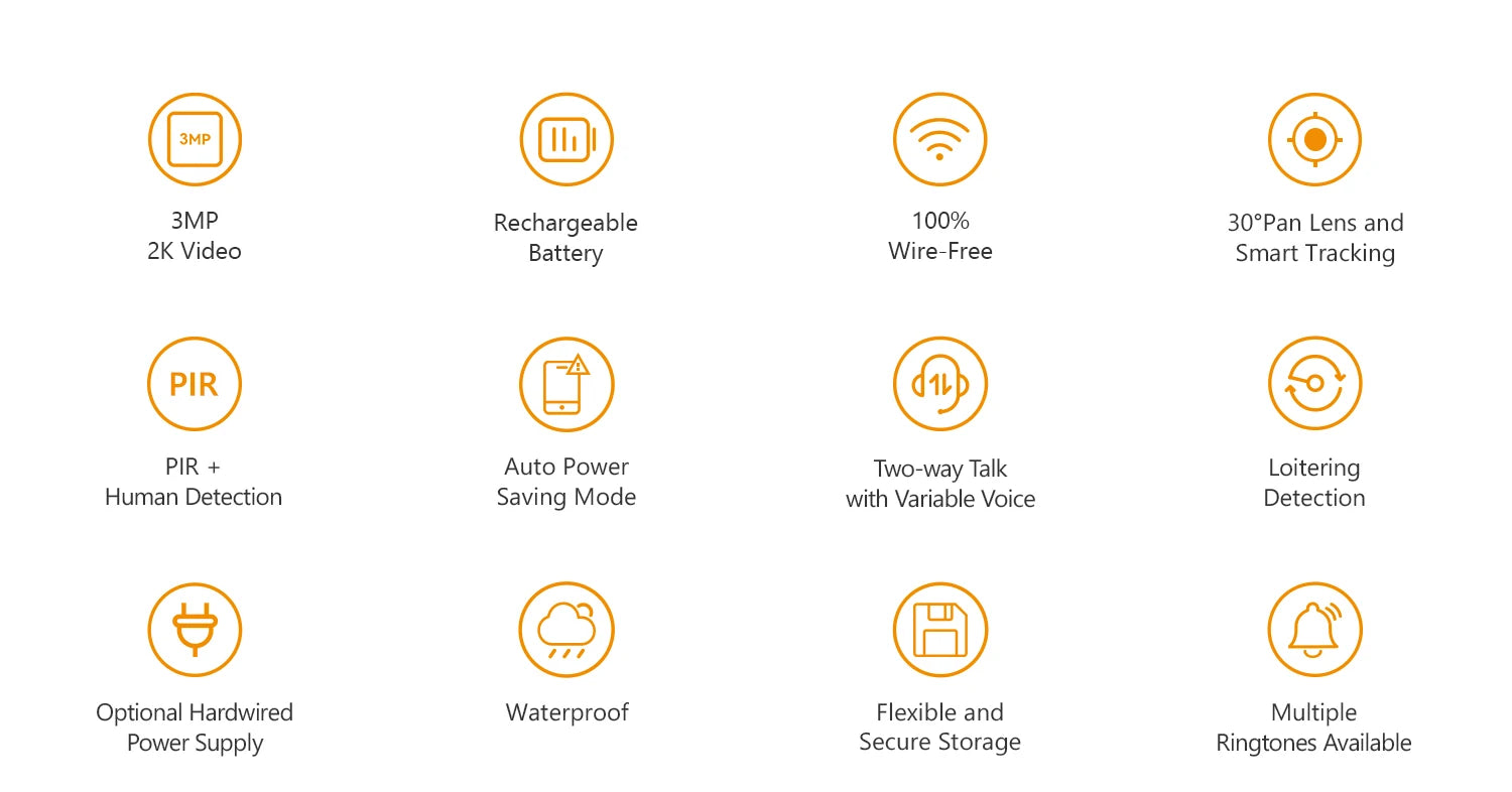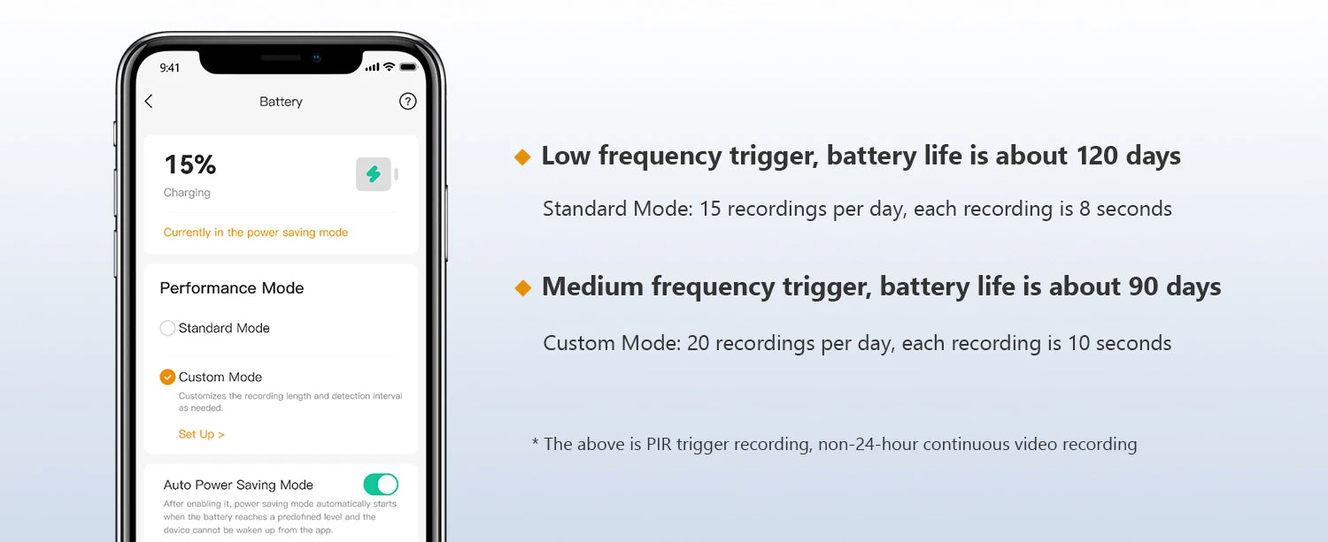 Auto Power Saving Mode: Extends battery life by only activating during motion events or doorbell calls.