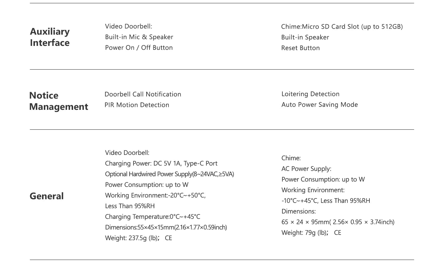 The rechargeable battery charges via USB Type-C (5V 1A), while the included chime doubles as a Wi-Fi extender, ensuring stable connectivity on 2.4GHz networks. Supports microSD cards up to 512GB for local storage.