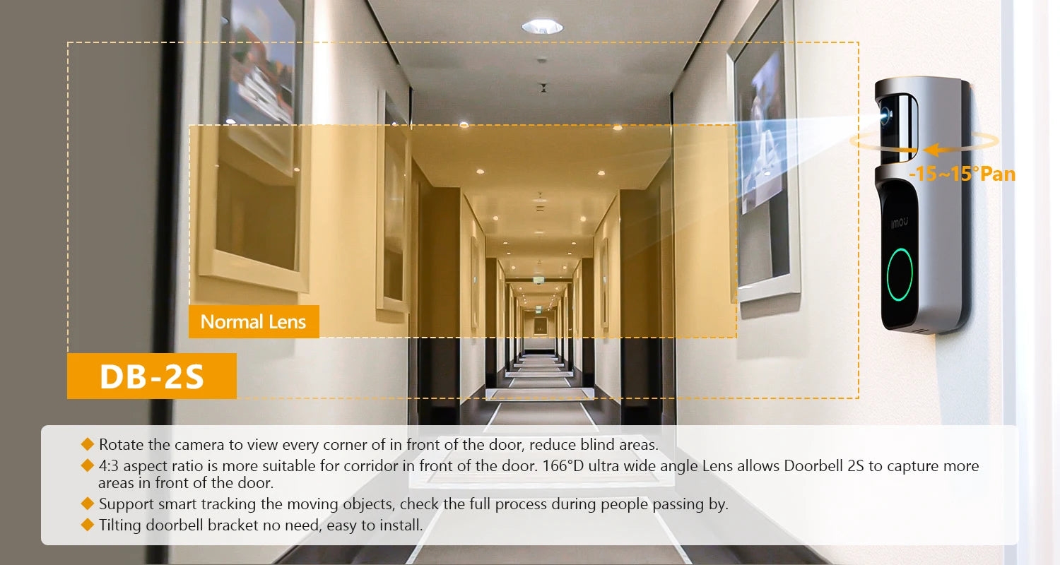 30° Pan Lens with Smart Tracking: Wide 166° ultra-angle view and 4:3 aspect ratio optimized for doorways. Automatically tracks people and movements.