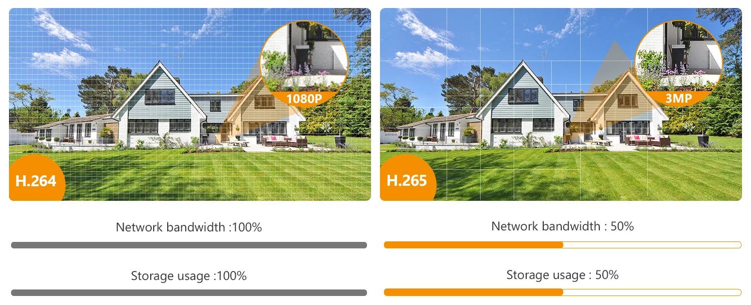 2K 3MP Resolution: Clear and sharp video quality with H.265 compression, saving up to 50% in storage and bandwidth.