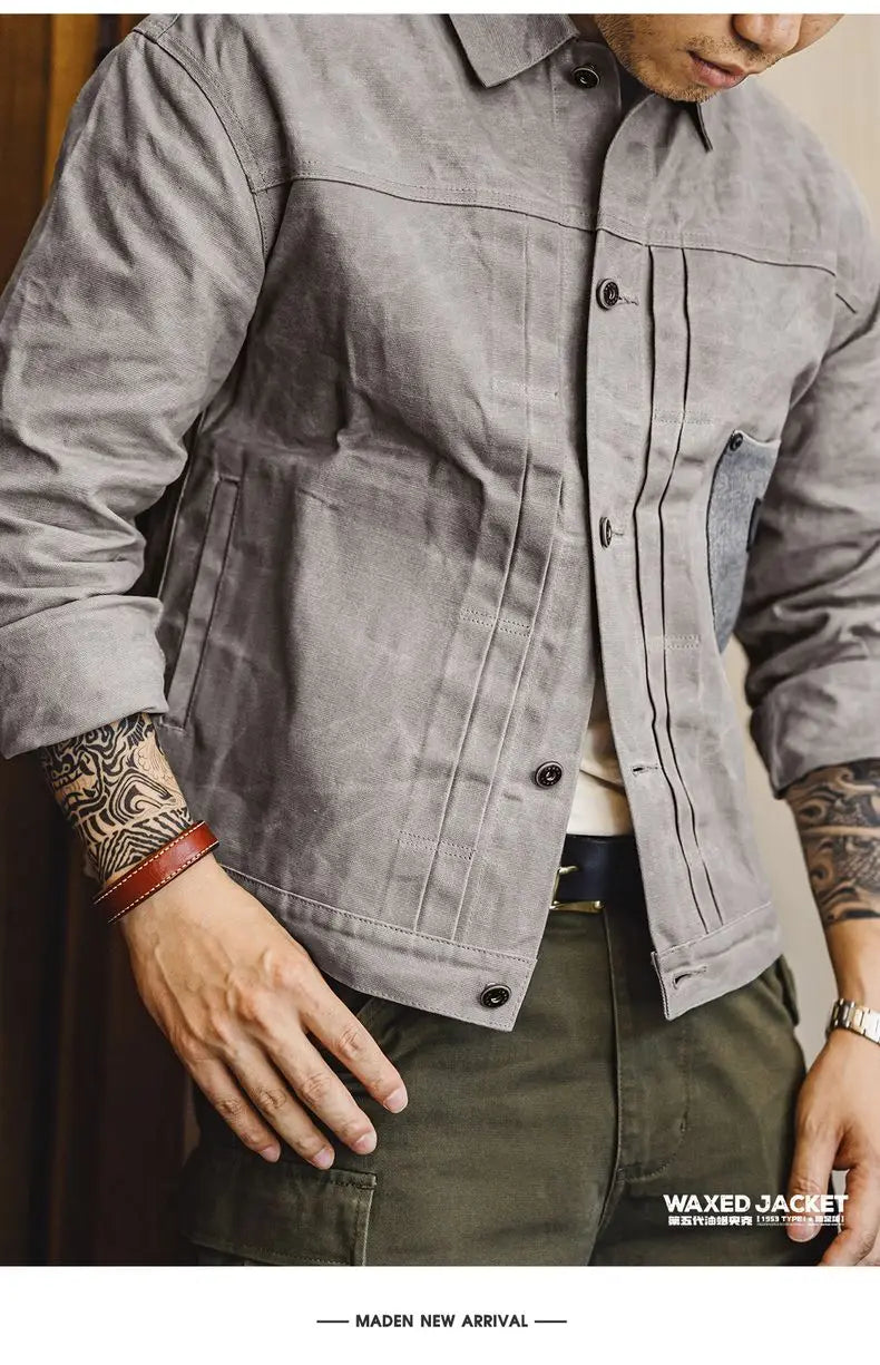 Maden Men's Vintage Grey Canvas Oil-Waxed Waterproof Hunting Jacket with Double Pleats and Patch Pockets for Autumn