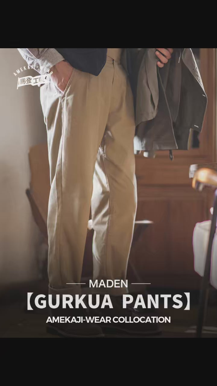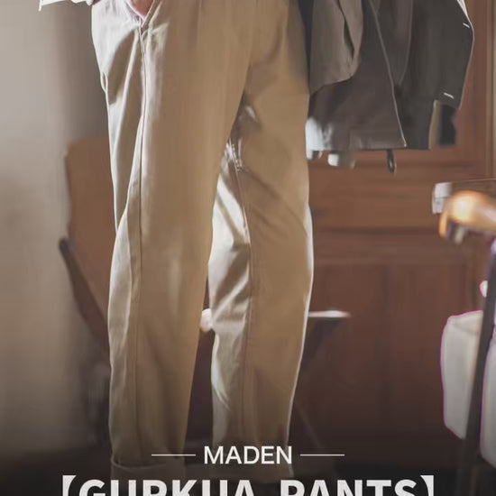 Men's Gurkha pants by MADEN, designed for casual and semi-formal wear. Made from 100% cotton herringbone fabric that is durable and maintains its shape after washing. Features a smooth, reliable YKK zipper and an adjustable waistband for a comfortable fit.