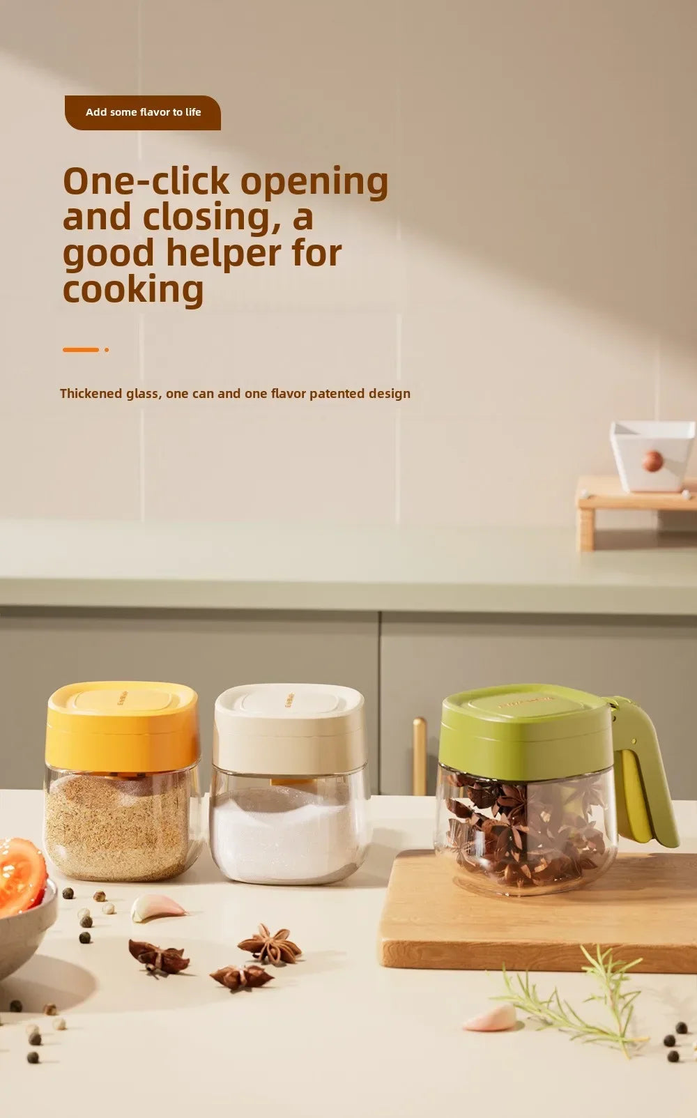 This transparent glass seasoning jar is perfect for storing and organizing your kitchen spices like salt, monosodium glutamate (MSG), chicken essence, and more. It features a convenient flip cover that keeps your seasonings fresh and protected from moisture. The included spoon makes it easy to scoop out the right amount without mess. Compact and practical, this spice jar is an ideal addition to any household kitchen, helping you keep your cooking ingredients handy and neatly stored.