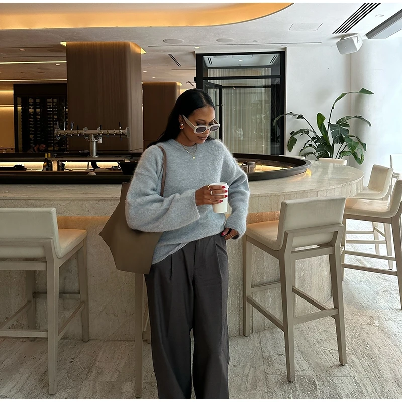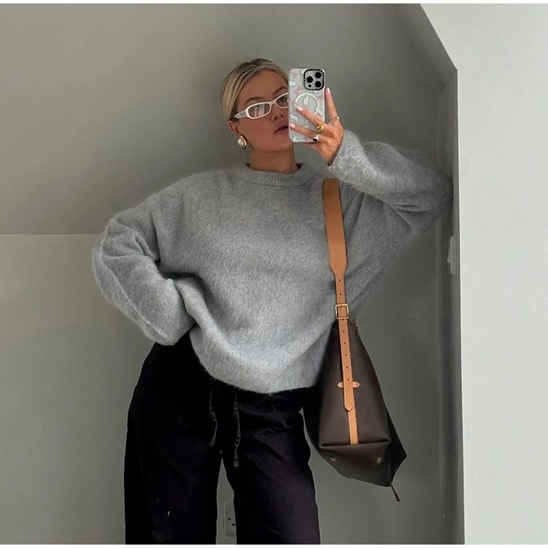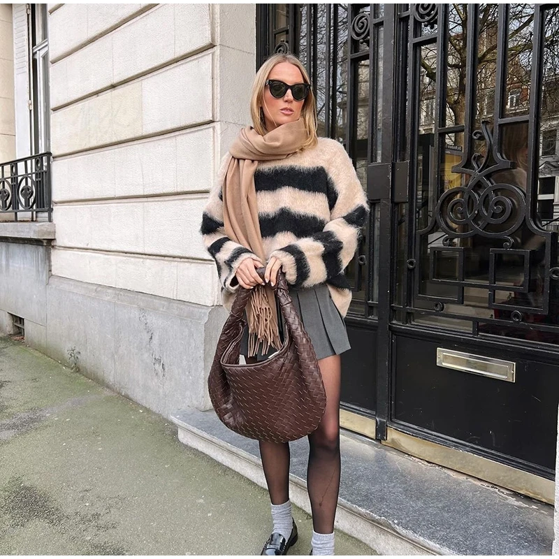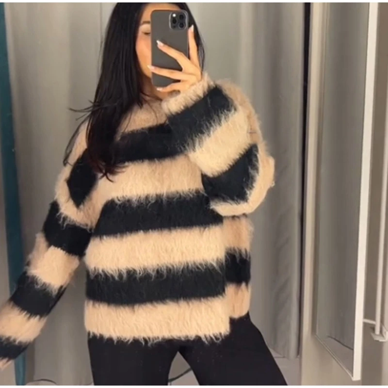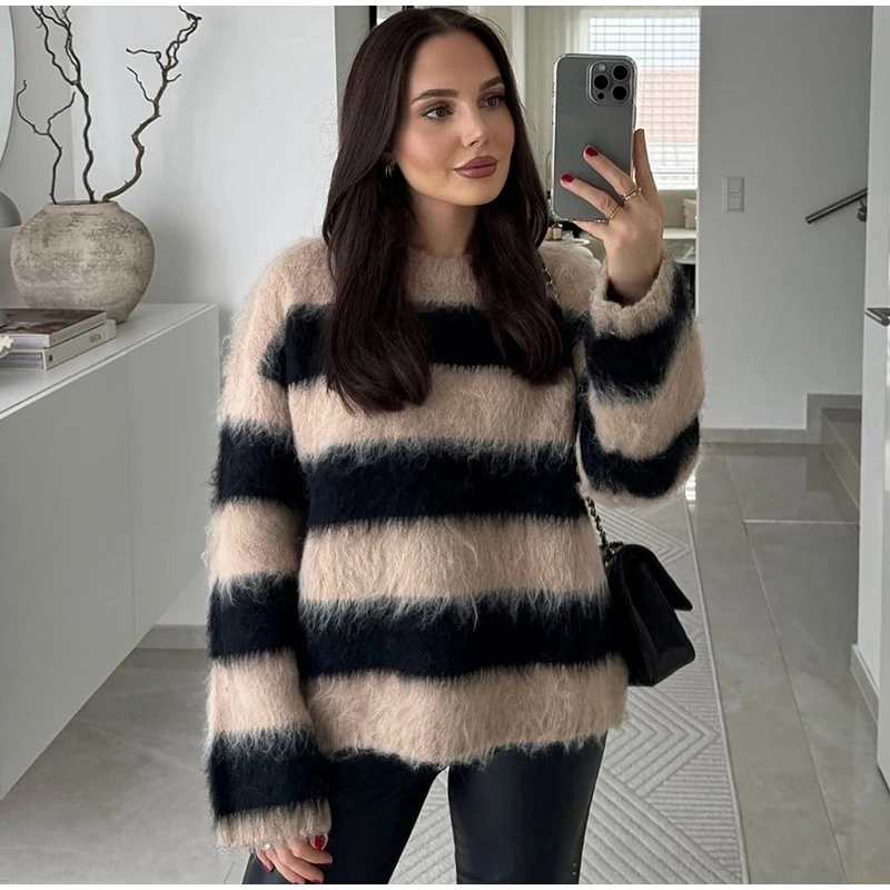 Women's Cozy Mohair Striped Knit Sweater – Warm O-Neck Pullover with Full Sleeves, Autumn 2025 Fashion